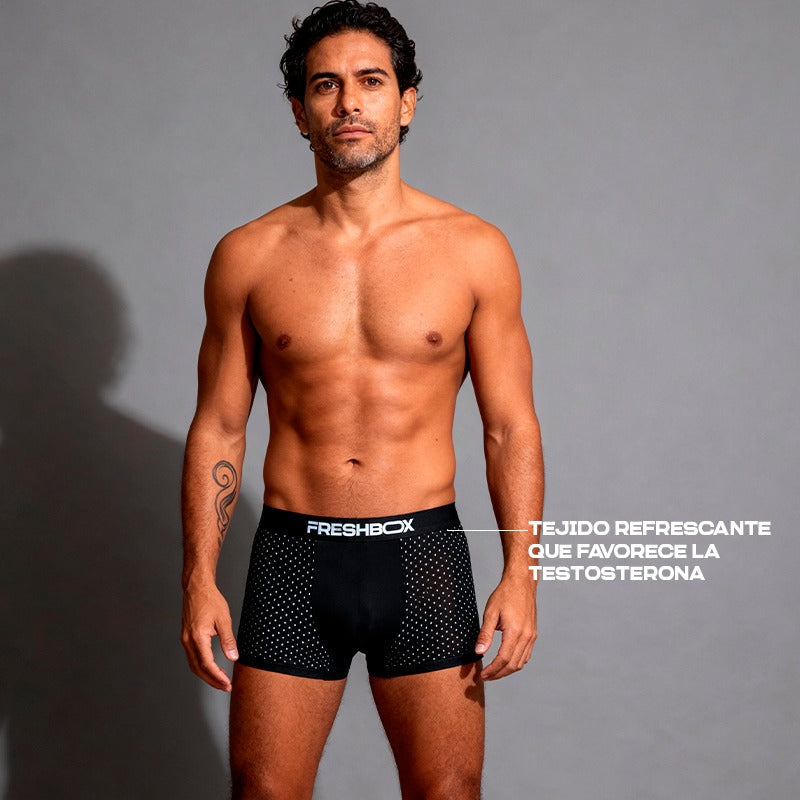 Nuestra ropa interior está diseñada con un tejido innovador que permite una óptima transpiración, manteniéndote fresco en cualquier situación. Además, cuenta con tecnología antiolor, que previene la acumulación de bacterias y garantiza una sensación de limpieza y confianza durante todo el día. Perfecta para quienes buscan comodidad, frescura y durabilidad en una sola prenda.